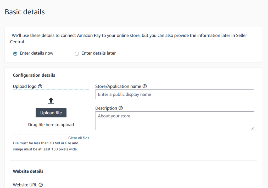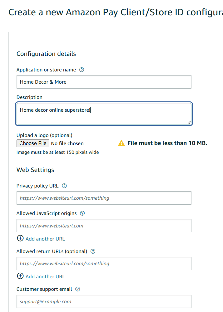In this field, you’ll enter the full URL of your live website where Amazon Pay buttons or checkout might be used. This is a security measure that allows Amazon Pay to work only on authorized domains.