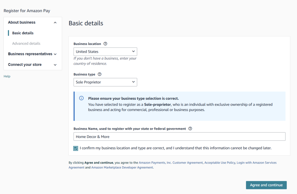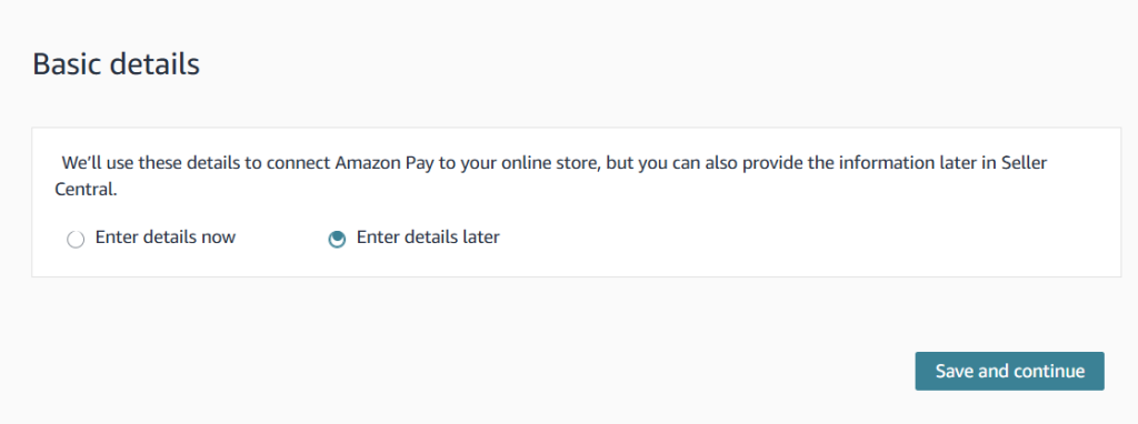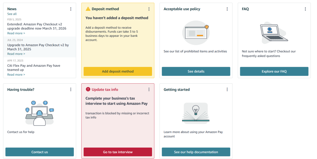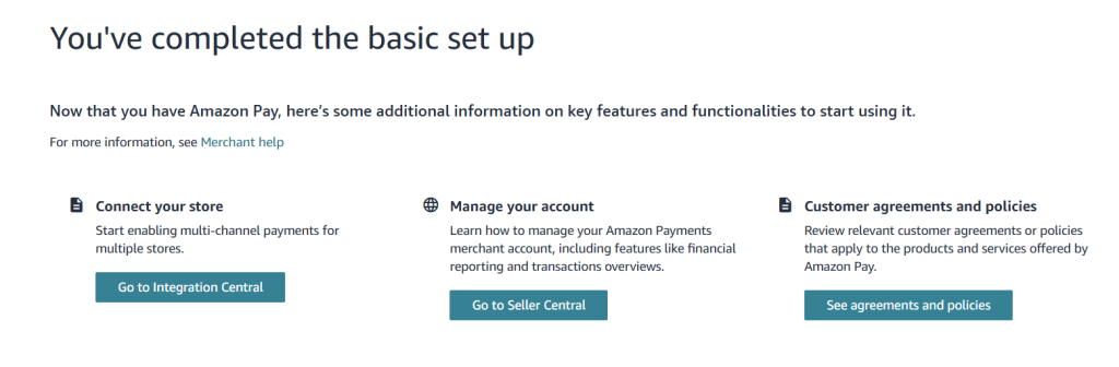 Your Amazon Pay account will now be connected. Revisit your Amazon Pay central account and be sure to set up your deposit method and other important information