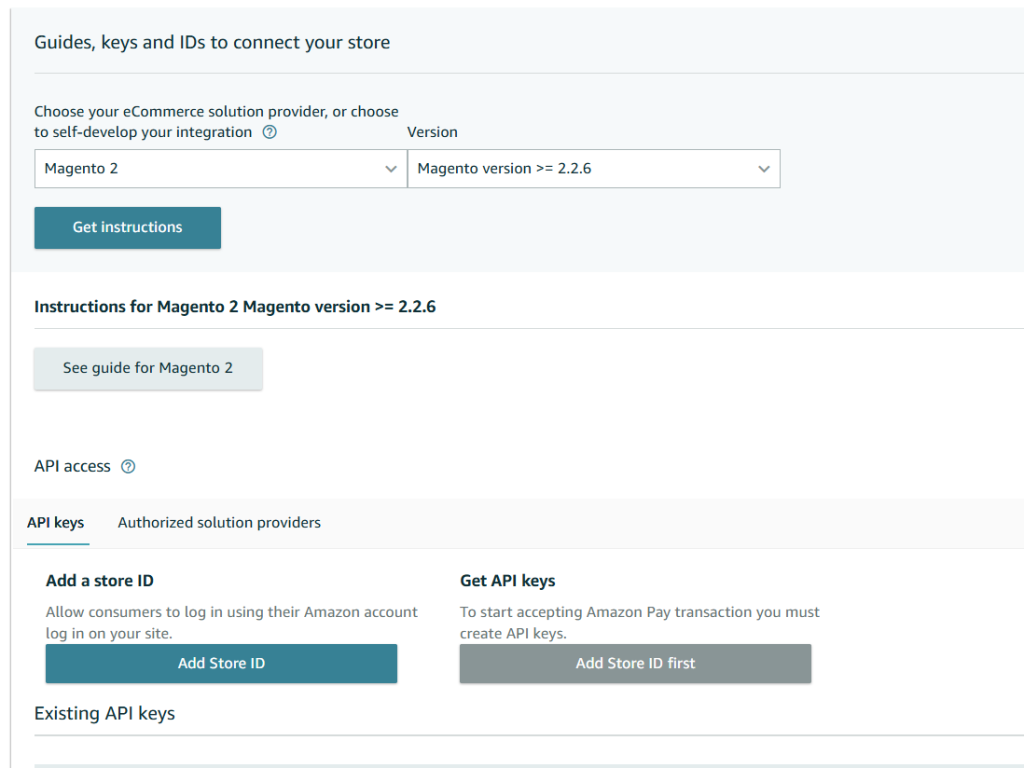 Click Get Instructions and then Click Add Store ID (this will enable you to generate all the secret keys you need to connect Amazon Pay to your website.