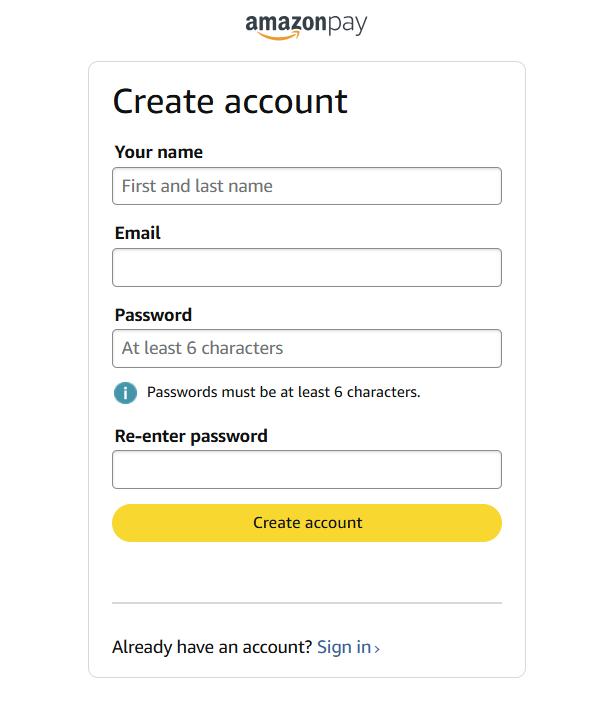 Enter your first name, email and password. Do not forget the email and password you are using for Amazon Pay