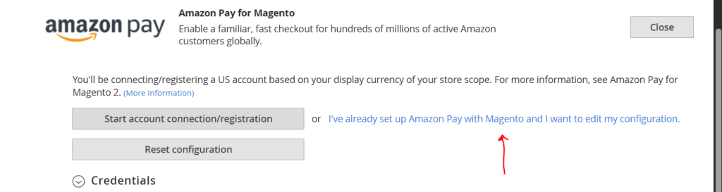 Scroll down to Amazon Pay > Click Configure > Click I’ve already set up Amazon Pay