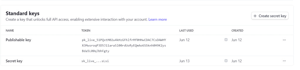 Here you will see your Live publishable API key and you can generate a secret key. Copy both of these and paste them into the General Settings section on your website in Stripe area.